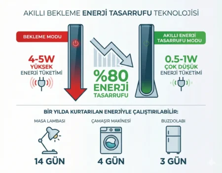 Akıllı açma-kapama sistemi sayesinde cihaz, bekleme modunda otomatik olarak enerji tasarruf moduna geçer. Standby tüketimini 4–5W seviyesinden 0,5–1W’a düşürerek %80’e varan enerji tasarrufu sağlar ve uzun vadede elektrik maliyetlerini azaltır.