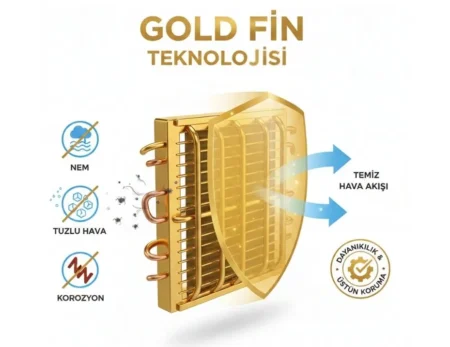 Altın kaplama ısı eşanjörü sayesinde bakır boru ve alüminyum kanatlar korozyona karşı korunur. Nemli, tuzlu ve zorlu çevre koşullarında daha uzun ömür ve daha stabil performans sağlar.